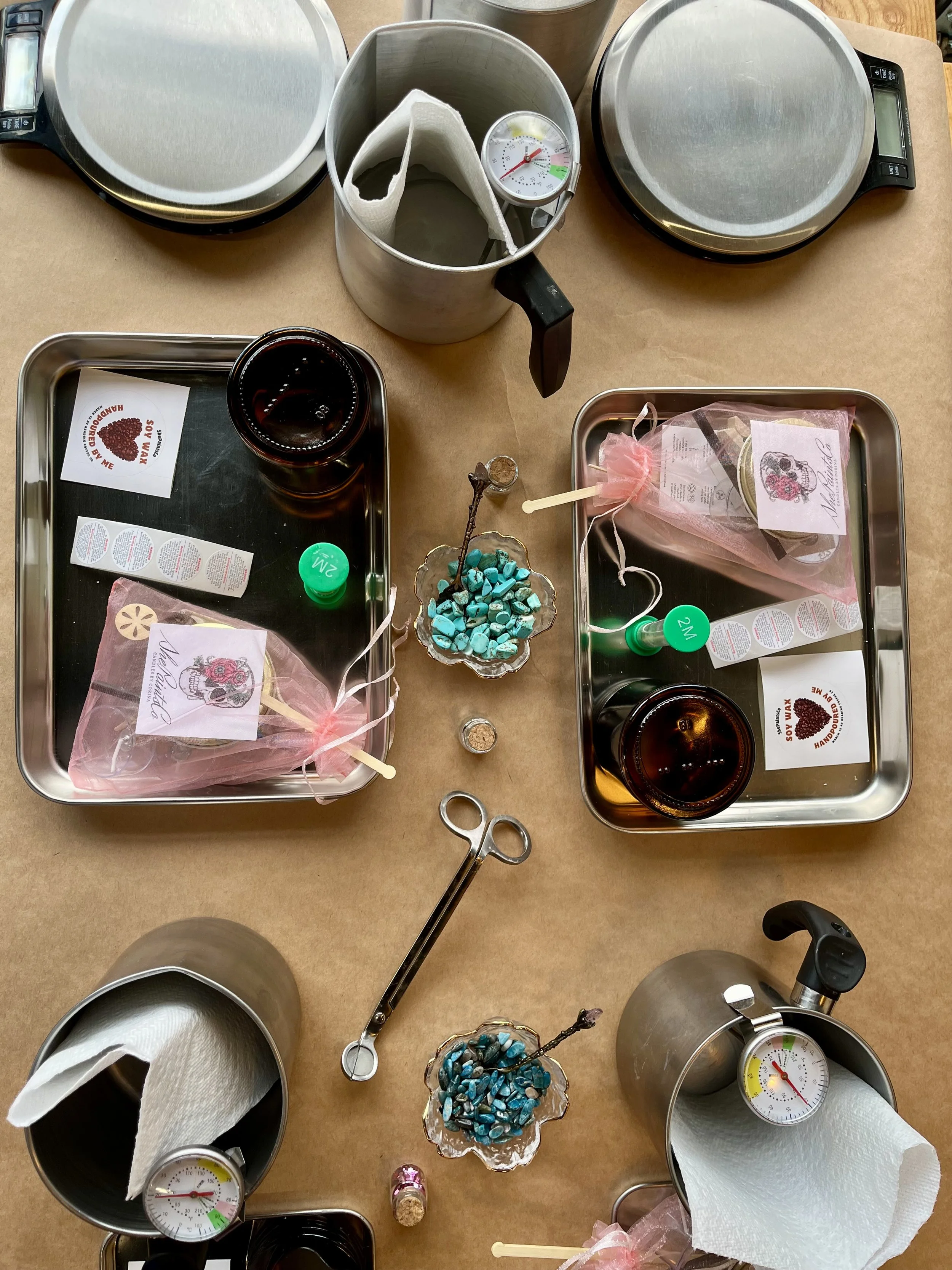 This event includes all tools needed for your candle making experience. A wax melter is provided to pre-melt the soy wax, which is then poured into your own pour pitcher to blend with choice fragrance oils. Individual tea lights hold .6 oz of wax and burn up to 5 hours each. Trade tea lights you create with others in the group to leave with a variety of scents infused with each others creative expression.